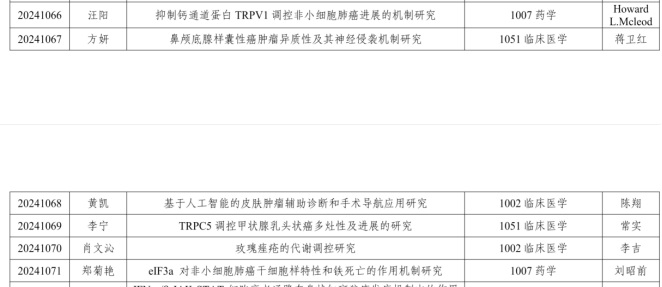 荣获优秀博士学位论文的博士分别为:郑菊艳博士,导师:刘昭前教授,论文题目:《eIF3a对非小细胞肺癌干细胞样特性和铁死亡的作用机制研究》;汪阳博士,导师:Howard L.Mcleod教授,副导师:贺毅憬教授,论文题目:《抑制钙通道蛋白TRPV1调控非小细胞肺癌进展的机制研究》